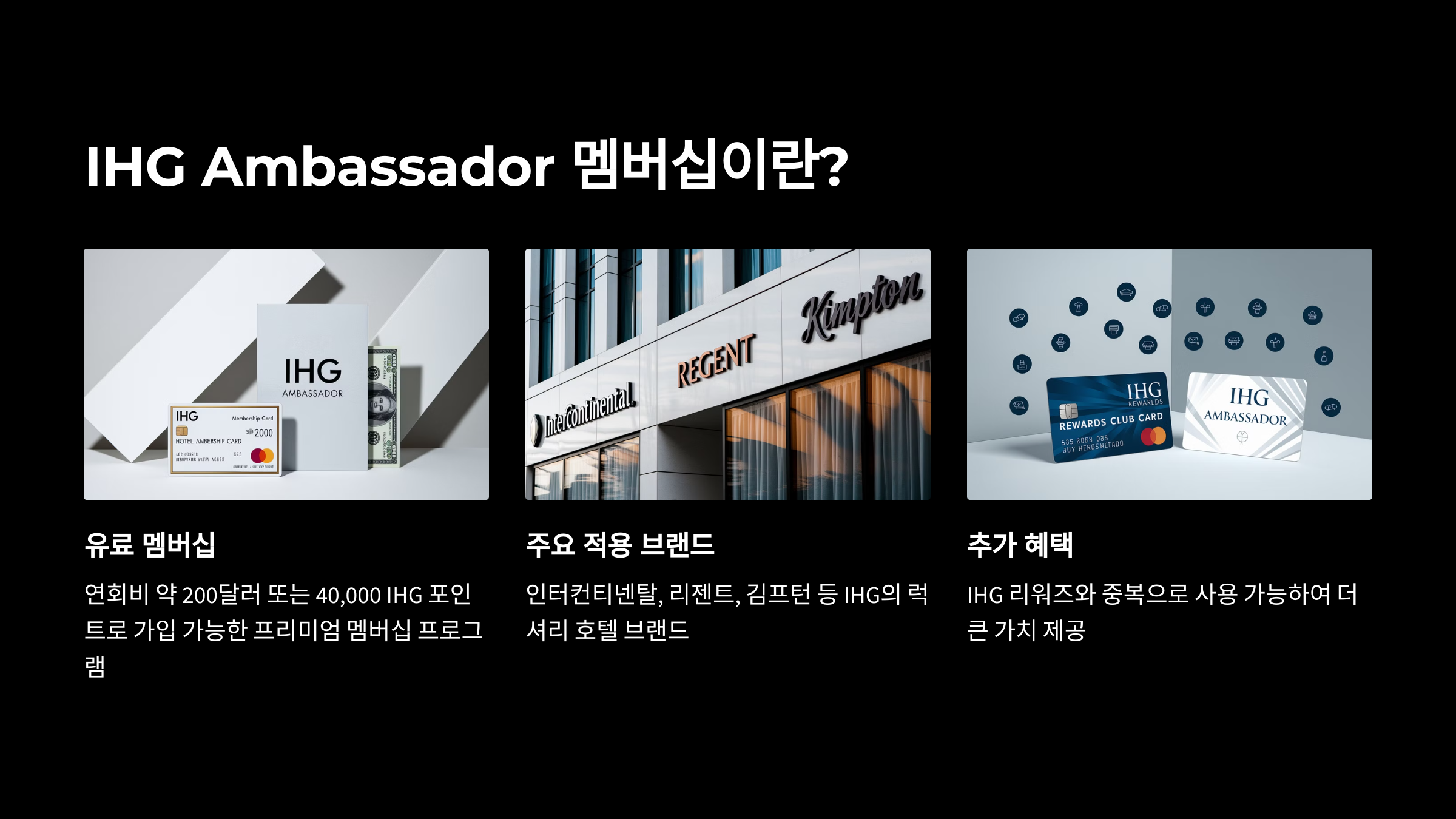 | 적용 브랜드 | 인터컨티넨탈, 리젠트, 김프턴 | IHG 전체 브랜드 |