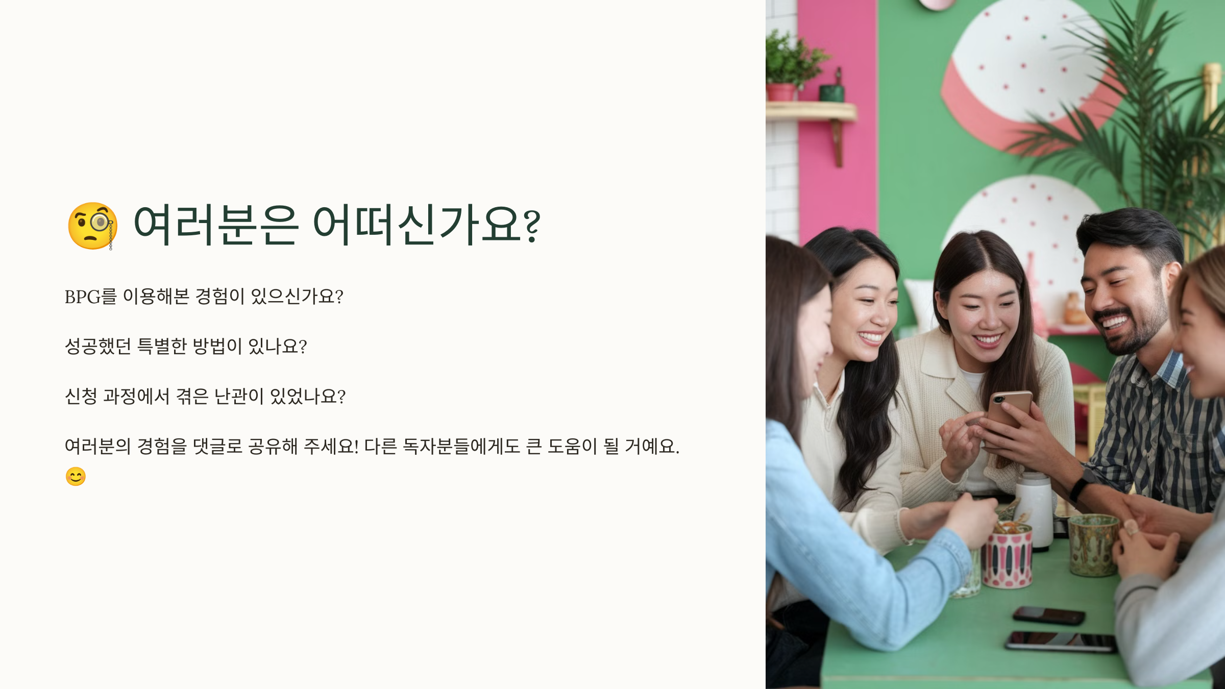 혹시 BPG를 이용해본 경험이 있으신가요? 성공했던 팁이나 어려웠던 점을 댓글로 공유해 주세요!