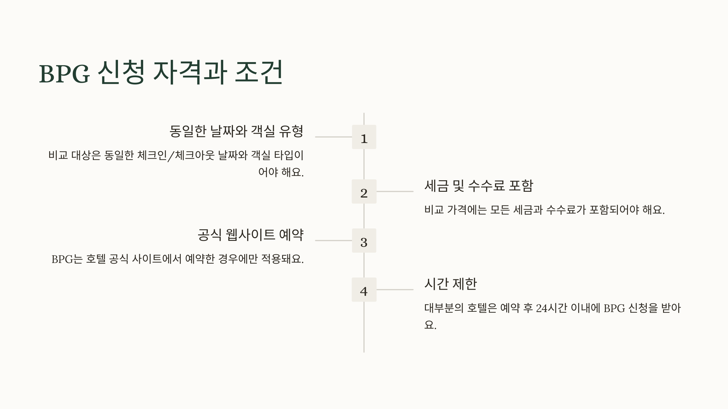 - **시간 제한:** 대부분의 호텔은 예약 후 24시간 이내에 BPG 신청을 받아요.