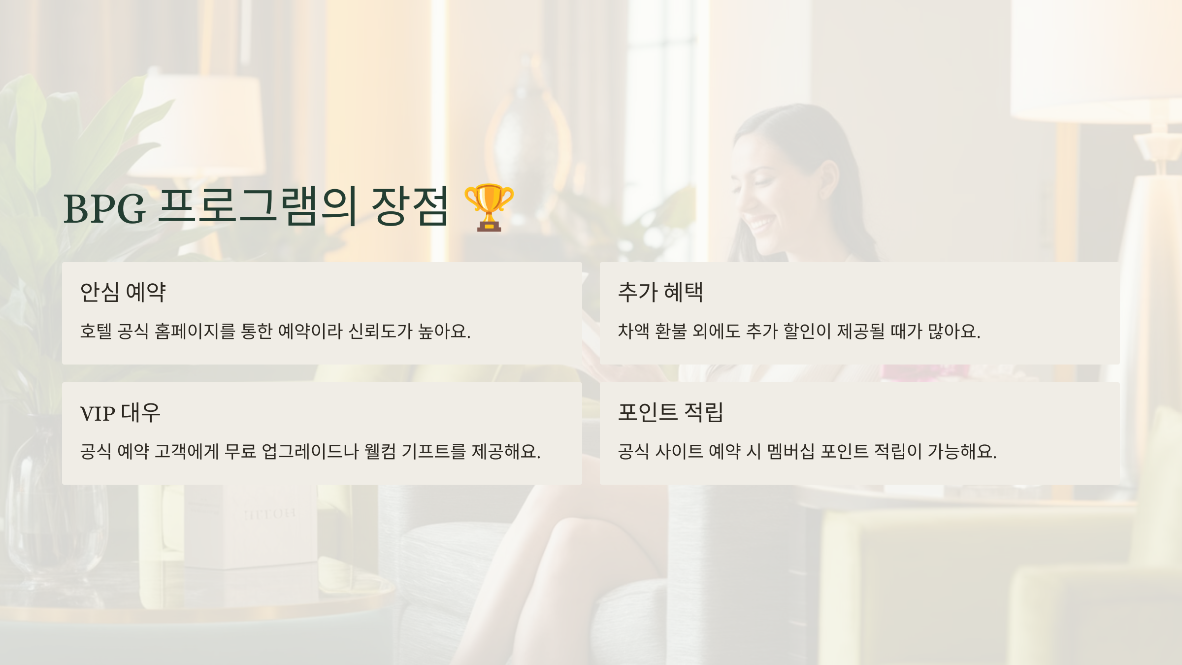 - **공식 웹사이트 예약:** BPG는 호텔 공식 사이트에서 예약한 경우에만 적용돼요.